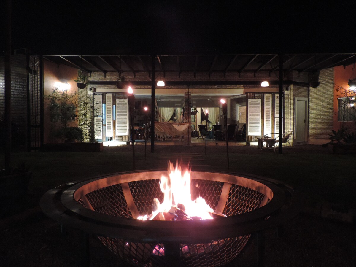 Residencia vacacional con espacios amplios y luminosos. Grandes ventanales en todas las dependencias con vista a los patios compartidos llenos de arboles. Ambientes climatizados para dias calurosos y para los dias frios una hermosa chimenea o un fogón en el exterior. Amplia galería con quincho, mesa de billar, de pinpong. Cancha de Voleibol y terraza en los arboles. Patio compartido con amplio estacionamiento, Wifi rapido, canales de Tv, Netflix, etc.