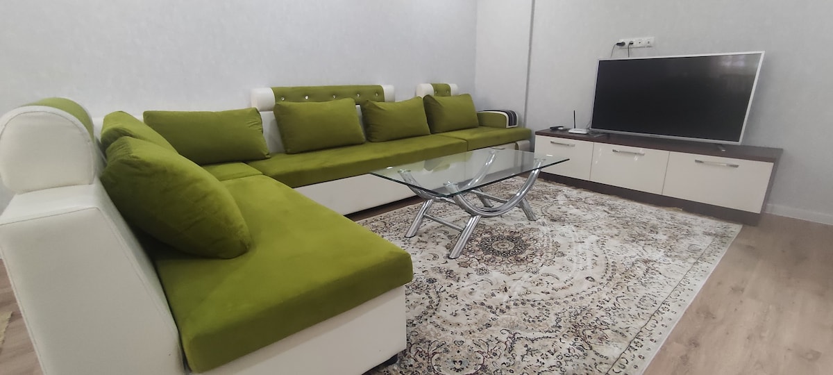 Վայելեք մնալ նորաոճ բնակարանում ։ Բացարձակ նոր, լուսավոր, ընդարձակ բնակարան նոր բնակելի համալիրում ՝ նոր վերանորոգմամբ: Հարմարավետ ննջասենյակ ՝ մեծ մահճակալով (180*200 )՝ օրթոպեդիկ ներքնակով ։ Խոհանոց - հյուրասենյակ ՝ հարմարավետ հանգստի համար անհրաժեշտ բոլոր հարմարություններով ։ Պատուհաններից բացվում է գեղեցիկ տեսարան դեպի քաղաք և գեղեցիկ լեռներ ։ Զբոսանք ամբողջ տարածքով ՝ զբոսայգիներով, խանութներով, բարերով, գիշերային ակումբներով, ռեստորաններով և սրճարաններով ։ 10 րոպե քայլեք դեպի կենտրոնական հրապարակ ՝ Ալա ։