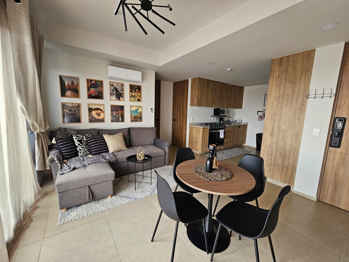 Encantador departamento con dos habitaciones, dos baños completos y una terraza encantadora, una cocina bellamente diseñada, una cómoda sala y un elegante comedor. Las habitaciones cuenta con espaciosos vestidores y baños privados. La terraza ofrece vista panorámica y un encantador espacio para el desayuno. Además, cuenta con un fabuloso restaurante de comida saludable y un gimnasio que ofrece clases de yoga y crossfit, y cancha de pádel con costos adicionales al alquiler del apartamento.