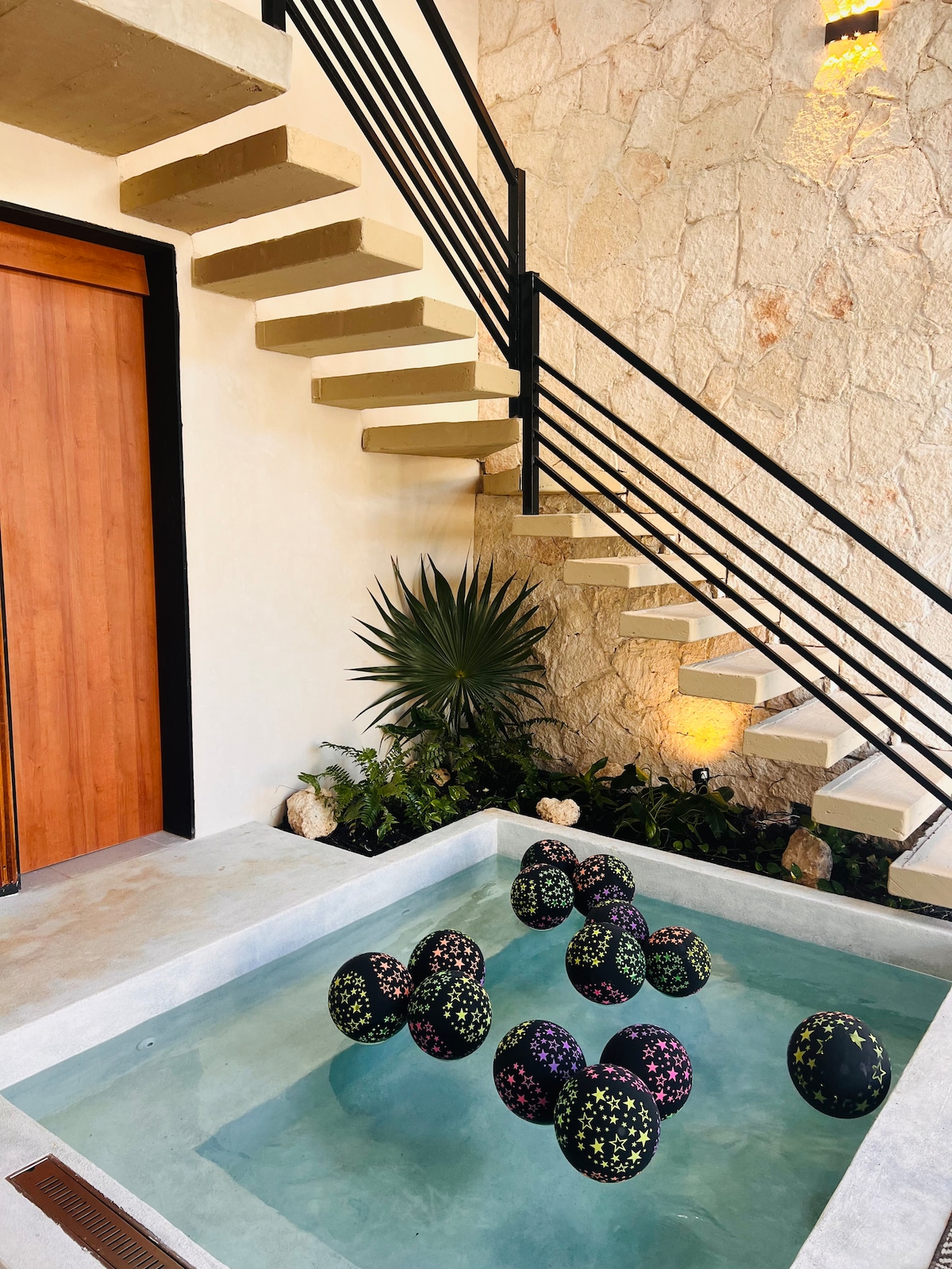 Casa Kokí is one of the only villas in Tulum with a heated private pool. Located in La Veleta, 20 min from the beach, our designer hideaway blends modern comfort with a local, bohemian vibe. Enjoy 100 Mbps Wi-Fi for work or streaming, then explore nearby cafés, bakeries, and bars. Roads here are unpaved and bumpy — part of the off-the-beaten-path charm — but you’ll return to a private, peaceful retreat where warm water, soft lighting, and jungle sounds set the mood for total relaxation.