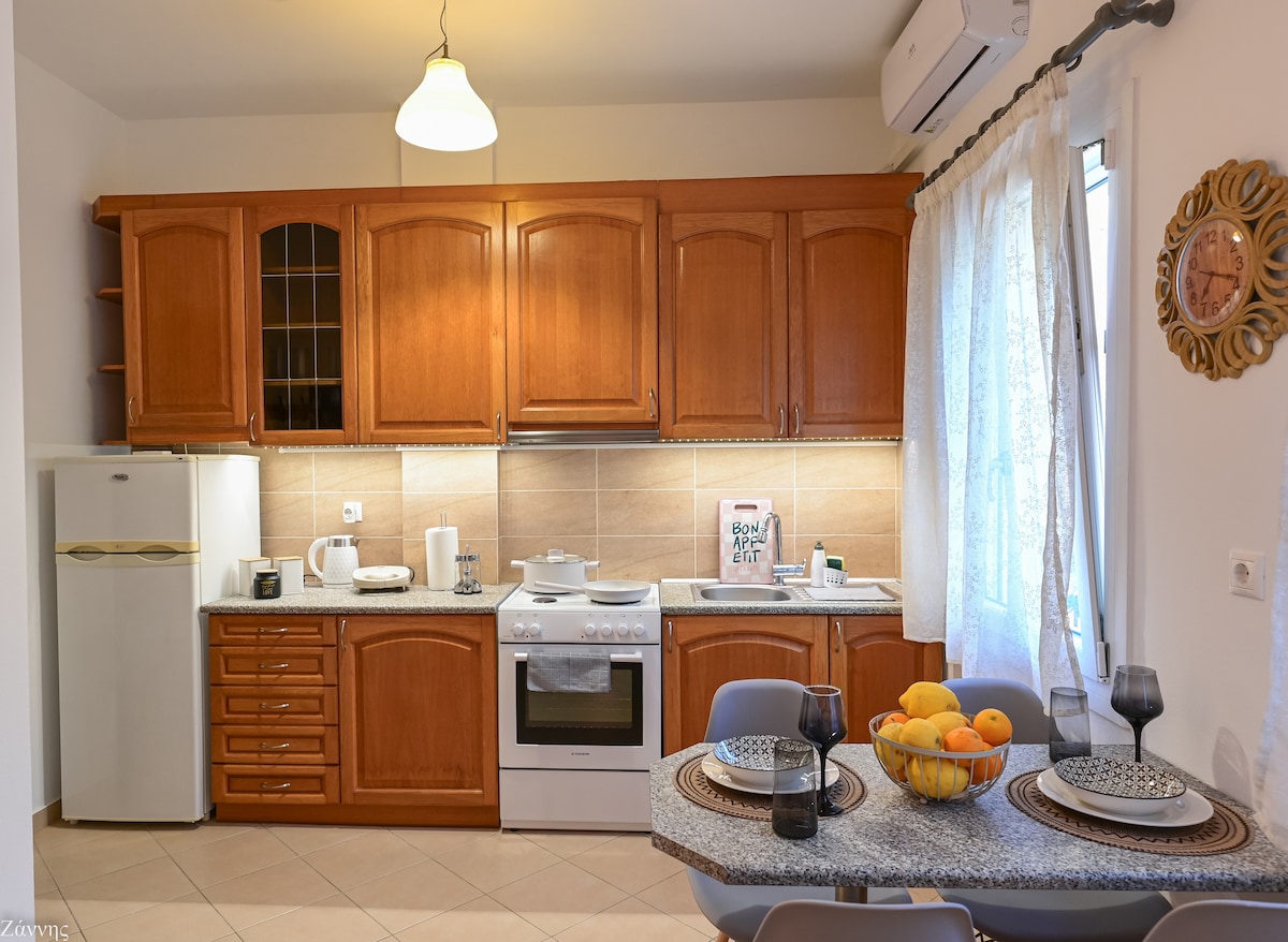 45 քմ մակերեսով նրբաճաշակ բնակարան ՝ Սամոս քաղաքի բնական ծովախորշի հիասքանչ տեսարաններով ։ Կենտրոնից հեռավորությունը 1,2 կմ է ՝ մասնավոր կայանատեղիով ։ Այն գտնվում է հանգիստ և անվտանգ թաղամասում և ունի բաց հատակագծով հյուրասենյակ ՝ խոհանոցով, մեծ պատշգամբով, մեկ ննջասենյակով և լոգասենյակով ։ Այն կարող է տեղավորել մինչև չորս հոգի, քանի որ ունի երկտեղանի մահճակալ և բազմոց, որը վերածվում է մահճակալի ։ Տարածքում կա սուպերմարկետ (1 կմ),լողափ(1,5 կմ), մարզասրահ (200 մ )։