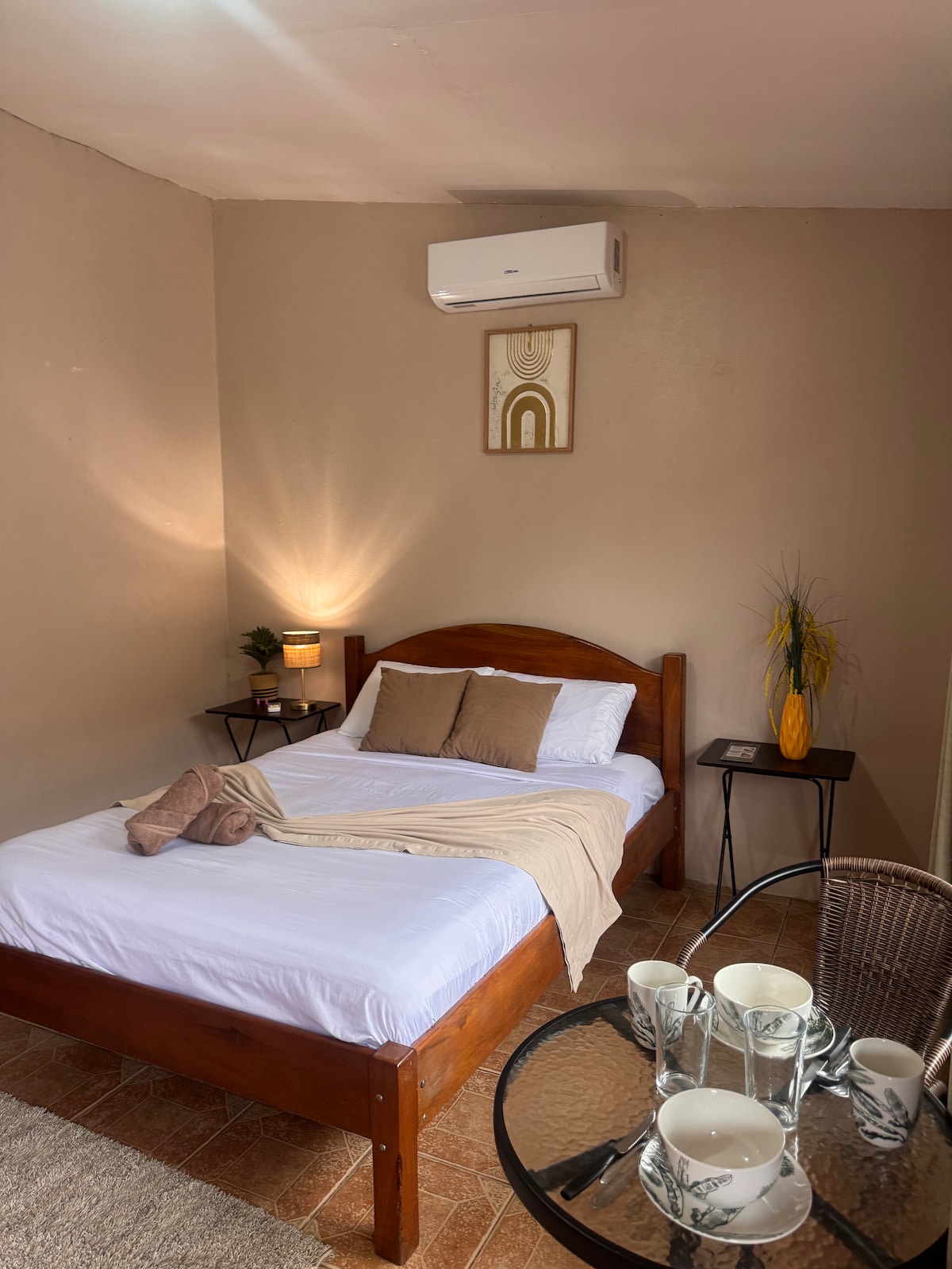 This beautiful studio is located just couple blocks away from La Fortuna downtown, which offers the versatility to explore the town and the touristic area without renting a car or parking and walking around This place is fully equipped, from fast wifi (+200mbps), comfortable King size bed, A/C, Smart TV, kitchenette, dehumidifier. A private front porch with table, chairs & JACUZZI, full private bathroom with hot water and hair dryer, safety box large enough for computer, closet and parking spot