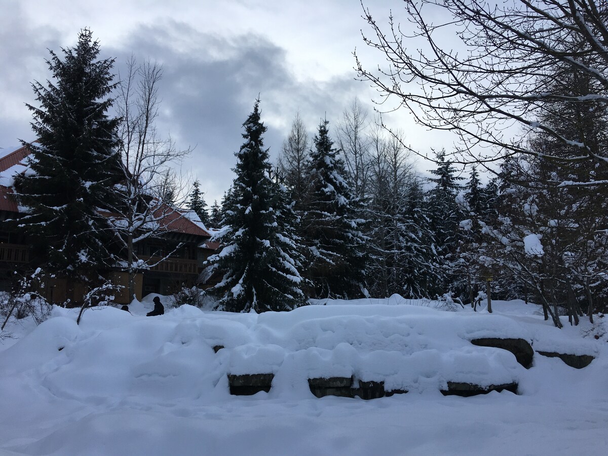 Welcome to your mountain oasis. A 1 min walk from the Blackcomb lift! Our modern condo is a bright, spacious 1 bedroom with wrap around windows for perfect tree-lined and mountain views. Look right up Whistler mountain while sipping coffee from your kitchen table! The suite has it all: - king bed - sofa bed - full kitchen including a new dishwasher - soaker jet tub - Keurig - Bose speaker - central A/C - upgraded July 2025 The building has a gym, laundry, pool and outdoor hot tub.