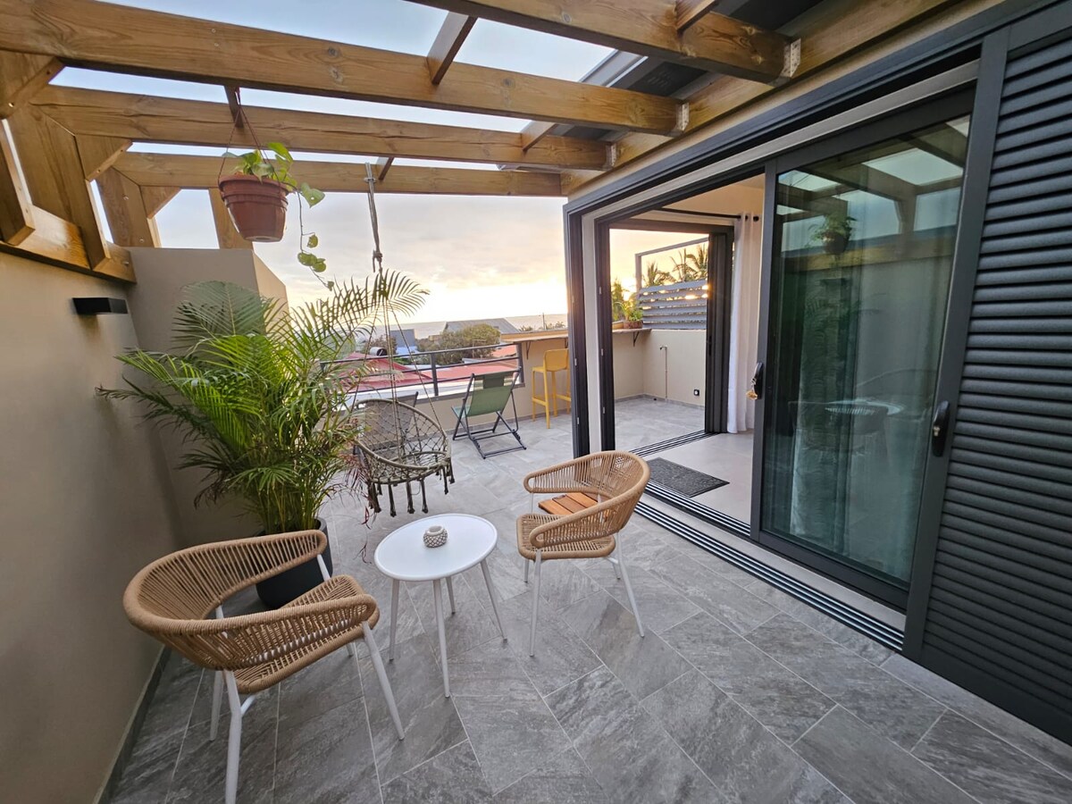 50 քմ մակերեսով շքեղ բնակարան Սուրբ Պիեռ ծովածոցի առաջին հարկում: Ծովին նայող իր 30 մ2 մակերեսով կտուրից կարող եք հիանալ ուրուր սերֆերներով, ձմռանը ՝ կետեր, մայրամուտներ կամ պարզապես հանգստանալ ։ Ապշեցուցիչ 180° ծովի տեսարան: Հանգիստ, լիովին կահավորված և ճաշակով ձևավորված բնակարան: Անվճար Wi - Fi մասնավոր կայանատեղի ։ Հրաշալի արևայրուք Ընկերների կամ մեծ ընտանիքների համար միևնույն ժամանակ նույն կացարանում մեկ այլ բնակարան վարձակալելու հնարավորություն