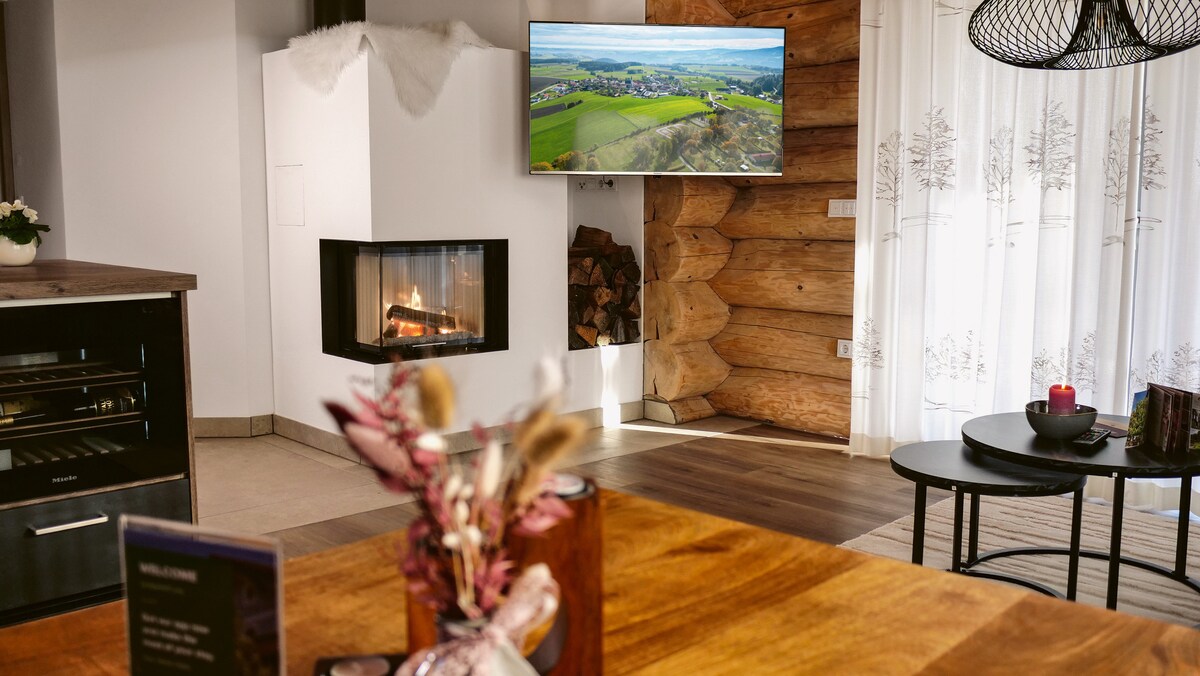 Mehr Raum für Freiheit und Entschleunigung Das Chalet Leni richtet sich an Paare, die neben Ruhe auch Großzügigkeit und Weite schätzen. Ebenfalls in absoluter Alleinlage, eingebettet in die Natur auf rund 700 Höhenmetern, verbindet es Komfort mit konsequenter Zurückhaltung. Die Architektur aus massiven Rundstämmen, natürliche Materialien und ein offenes Raumgefühl machen Chalet Leni zu einem Ort, an dem Zeit keine Rolle spielt.