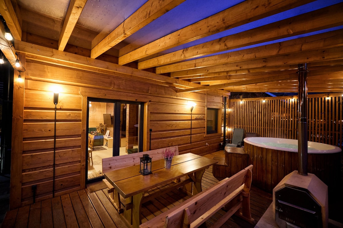 Luksusowy domek z balią na tarasie, sauną, basenem